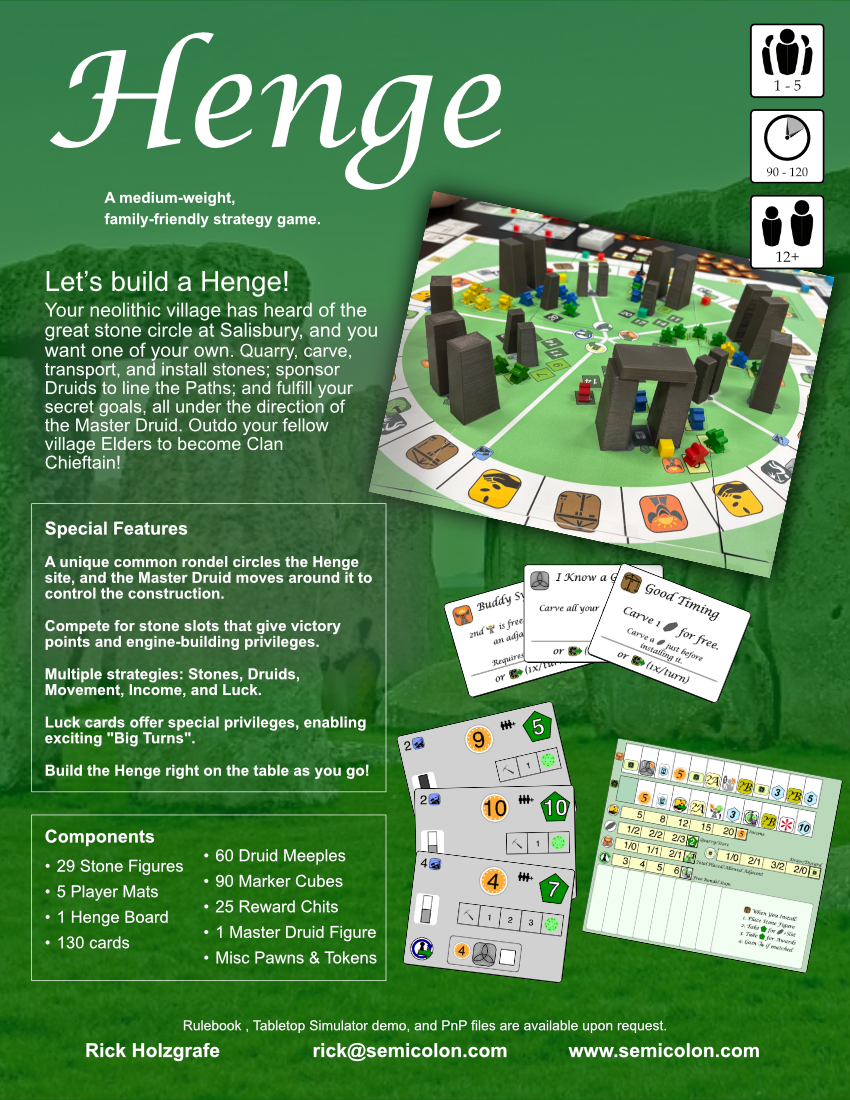1-5 players | Ages 12+ | 90-120 minsYou and the other Elders in your neolithic village have heard about the great stone circle built in the South, and you think it's a wonderful idea. (Think of the tourism! The merch! The gift shop!) So you have all determined to build a henge, a stone circle of your own. You will quarry the stones, carve them for extra holiness, transport them to the site, and install them in the Henge, all under the direction of the Master Druid (who is holy, but also bribable). You will also sponsor your own Druids to line the Druid Paths at the Henge. Do your part, and if you do it well enough, you could become the Village Chieftain in the new year!